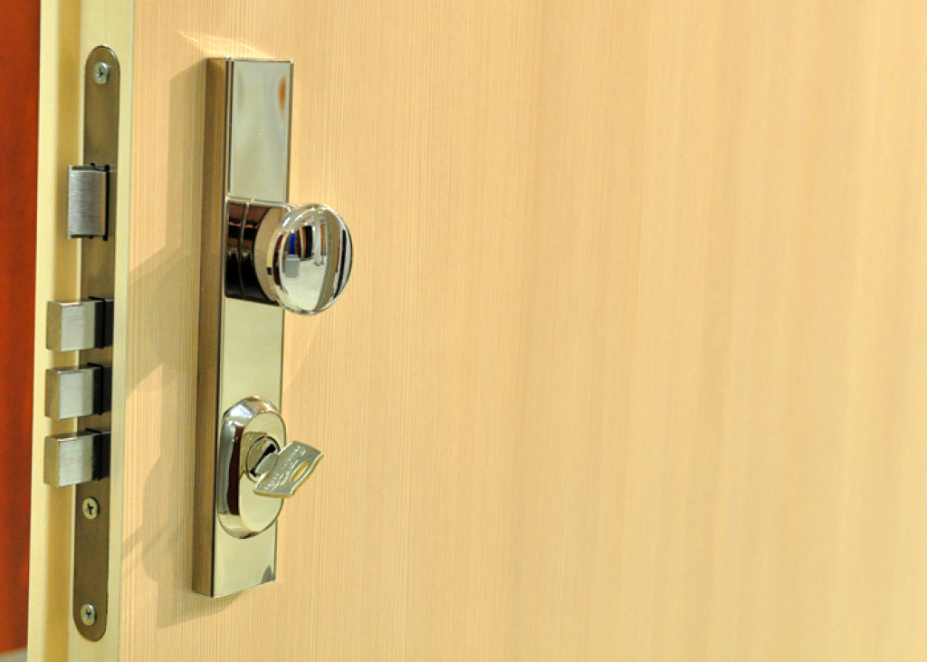 ADLO - Sicherheitstür TEDUO, glattes Design, Detail des Hauptschlosses, Türoberfläche Königsahorn