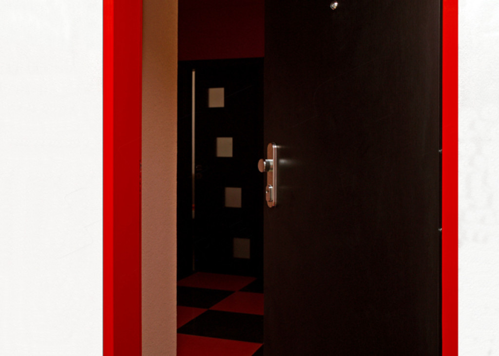 ADLO - Sicherheitstür TEDUO, glattes Design, Türoberfläche schwarz, Oberfläche der Türzarge rot RAL 3020