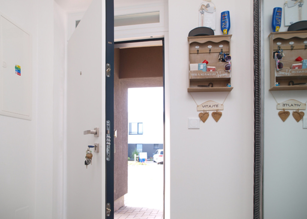 ADLO - Sicherheitstür LISBEO, Eingangstür in einen Kinderwagenraum, Türoberfläche Weiss