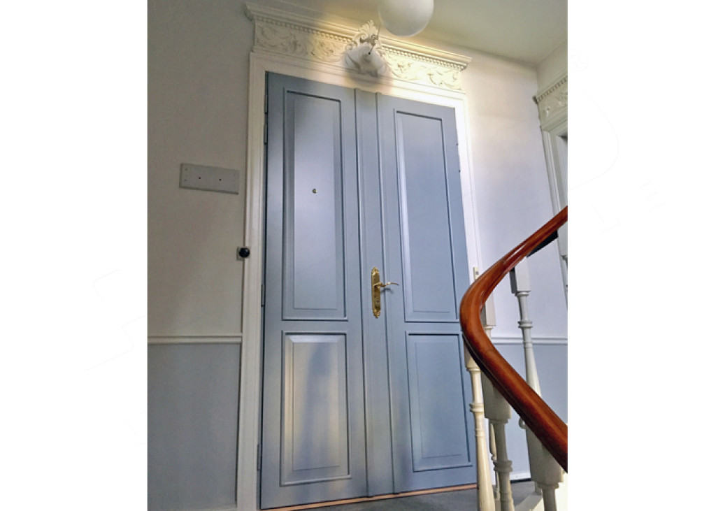 ADLO - Doppelflügel-Sicherheitstür ADUO, atypisches Kasettendesign, RAL 6019, atypische Verkleidung der Türzarge