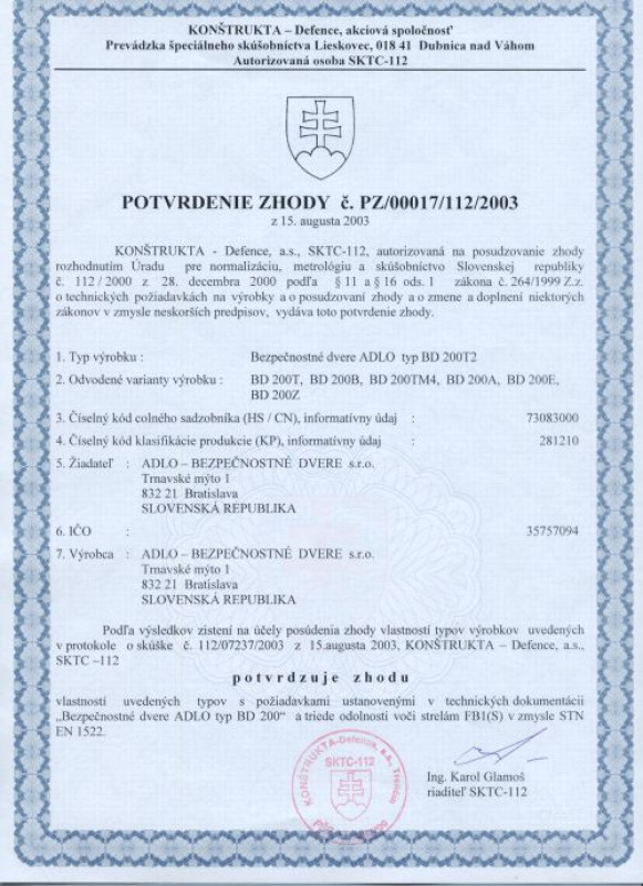 Zertifikat über Kugelsicherheit FB1 (laut den ENV 1522 Normen)