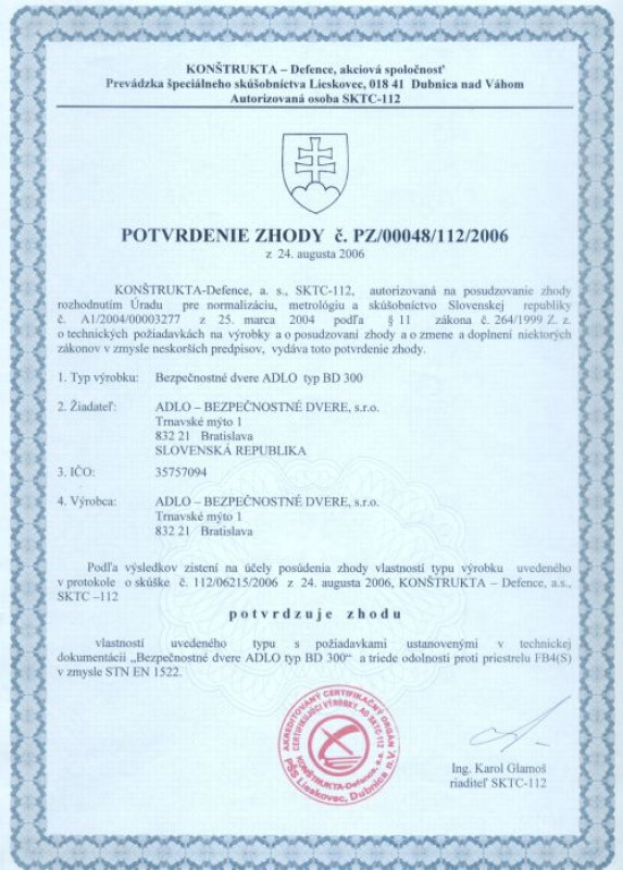 Zertifikat über Kugelsicherheit FB4s (laut den ENV 1522 Normen)