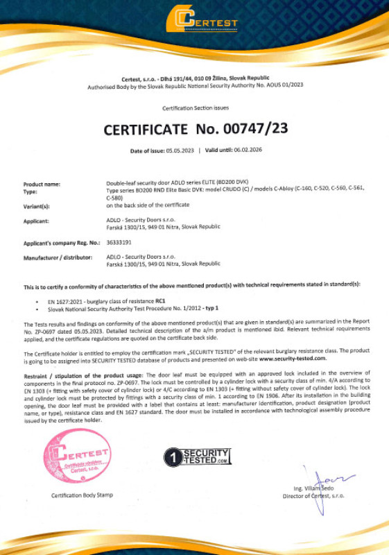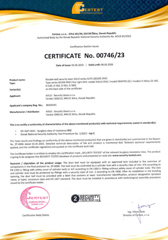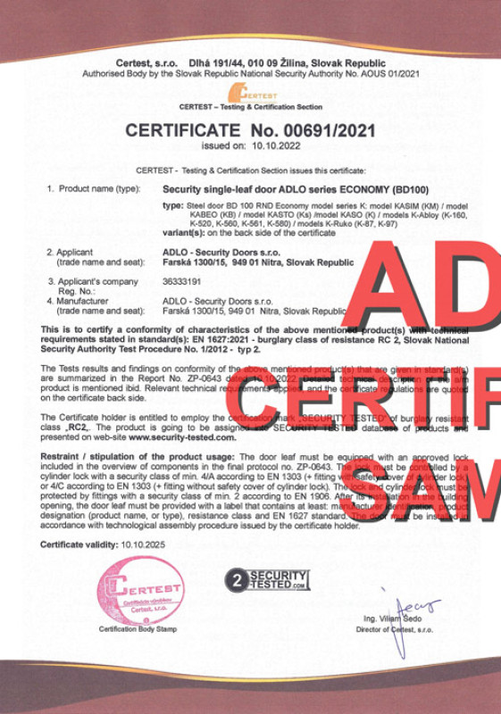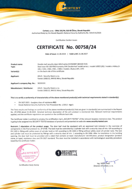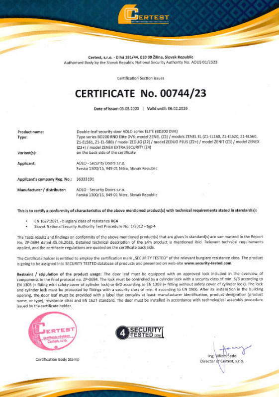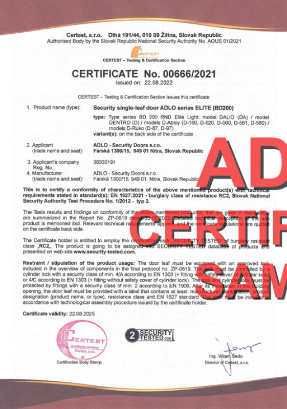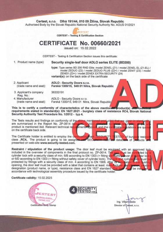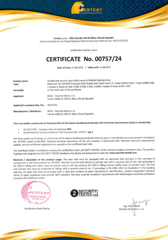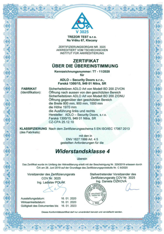 Zertifiziert im Österreichischen Normungsinstitut gemäß ÖNORM B 5338 für die 4. Sicherheitsklasse, ADLO Sicherheitstüren