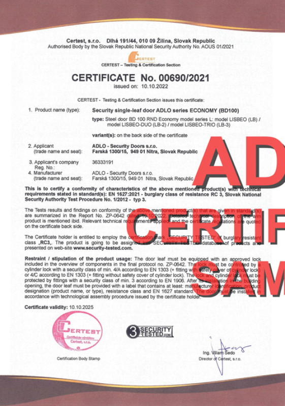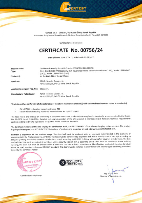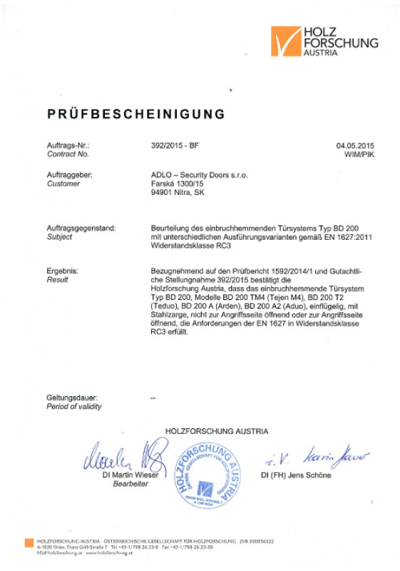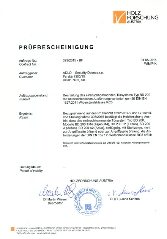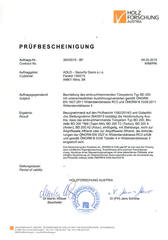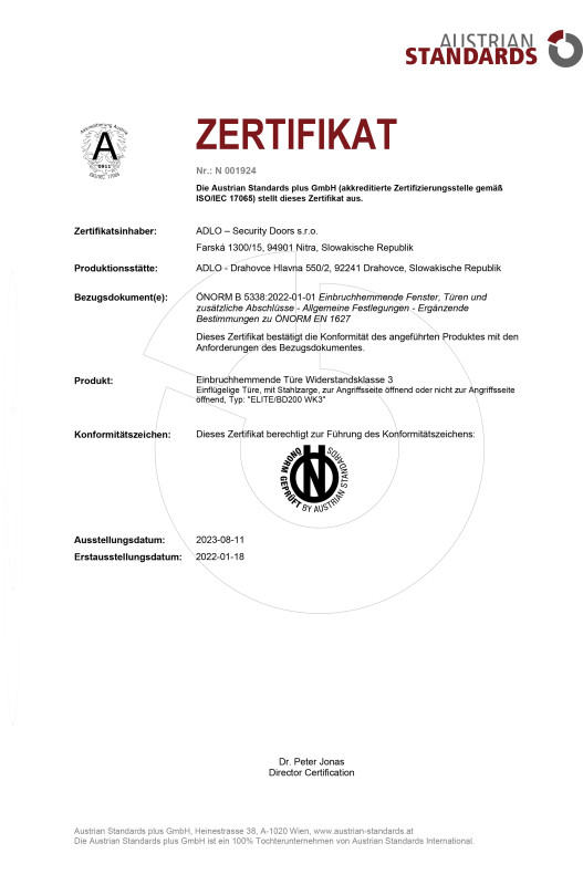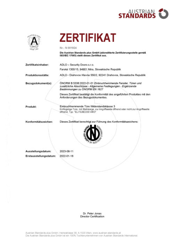 Zertifiziert im Österreichischen Normungsinstitut gemäß ÖNORM B 5338 für die 3. Sicherheitsklasse, ADLO Sicherheitstüren